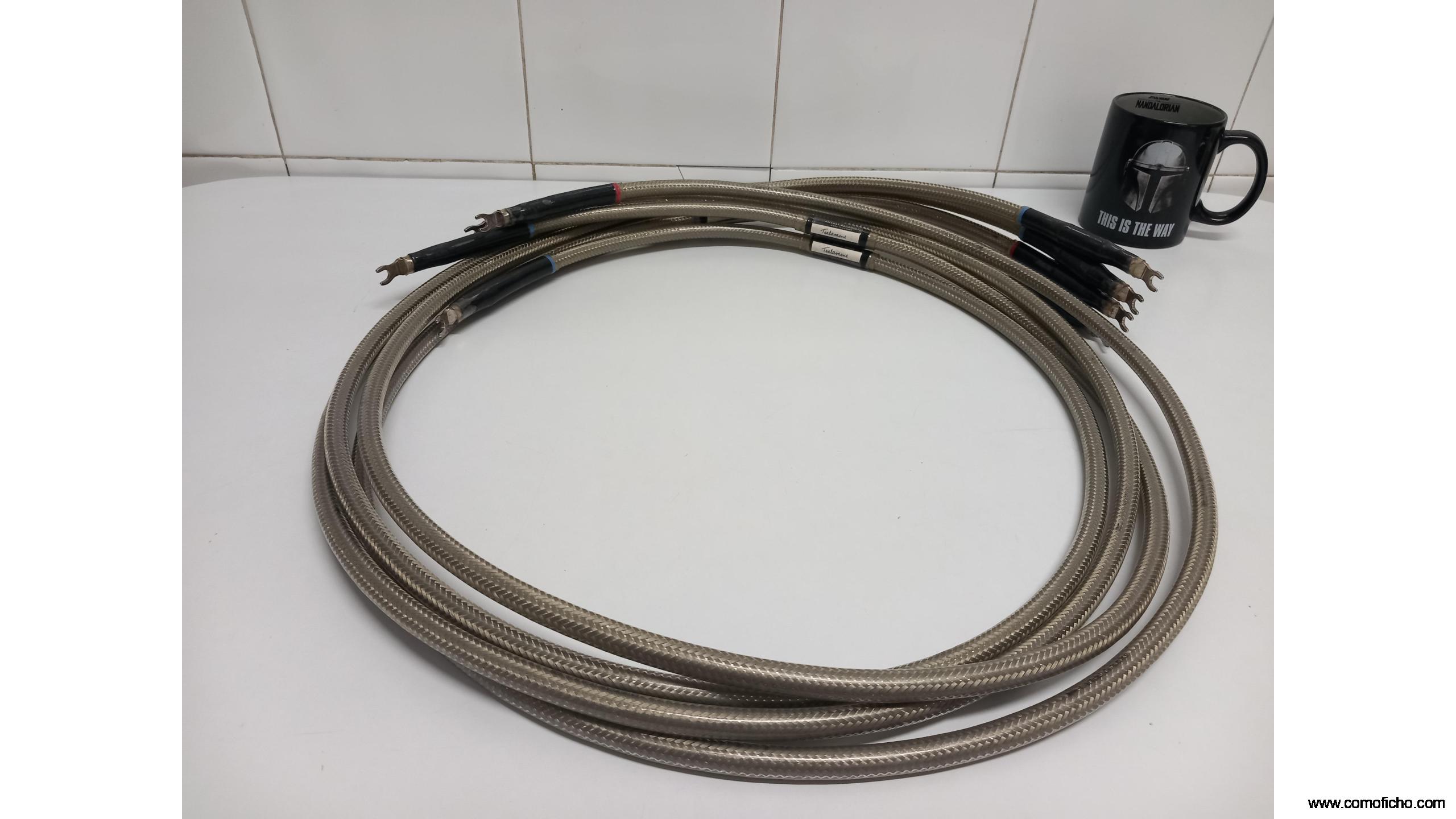 Cable de altavoces Virtual Dynamics Testament de 1.8 metros. El cable está completamente nuevo e impoluto, como puede apreciarse en las fotos. Marca de prestigio de sobra conocida. Conectores de espadas plateados en perfecto estado. Precio algo negociable.