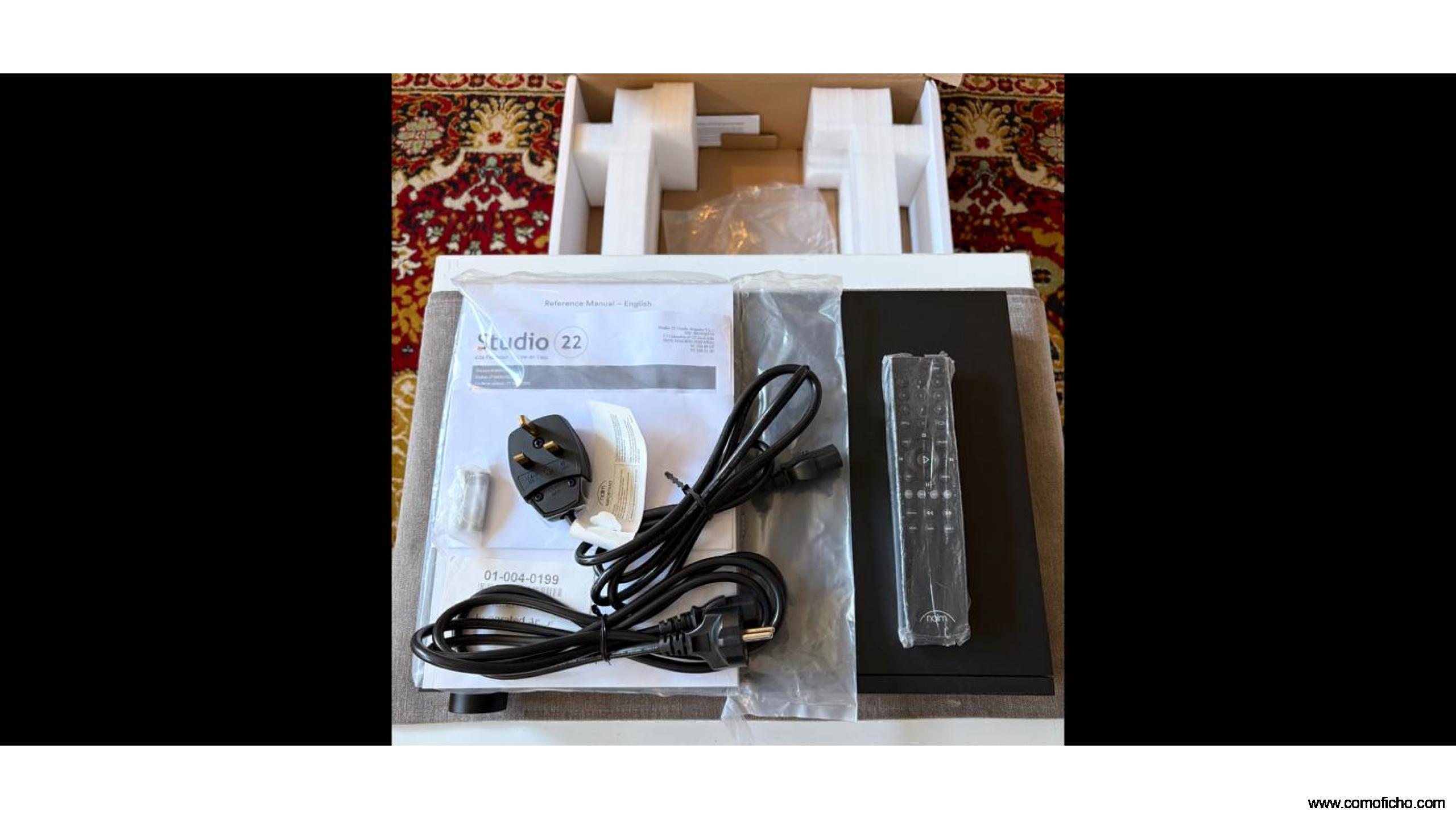 Tal como se ve en las fotos viene con su doble caja de protección y todos los accesorios (cables de red , mando a distancia con su plastico protector, libro de instrucciones , factura de compra ).