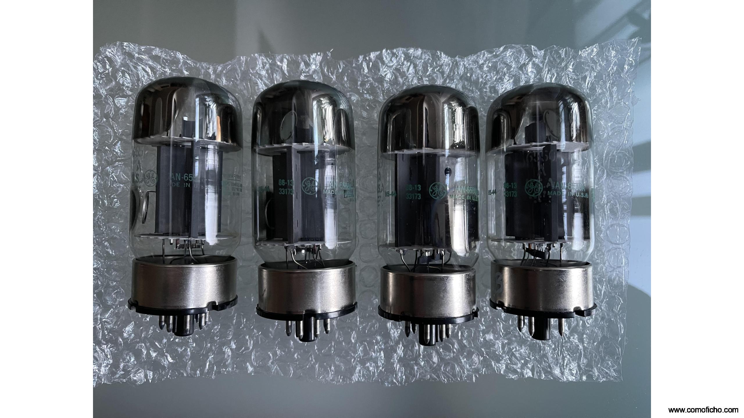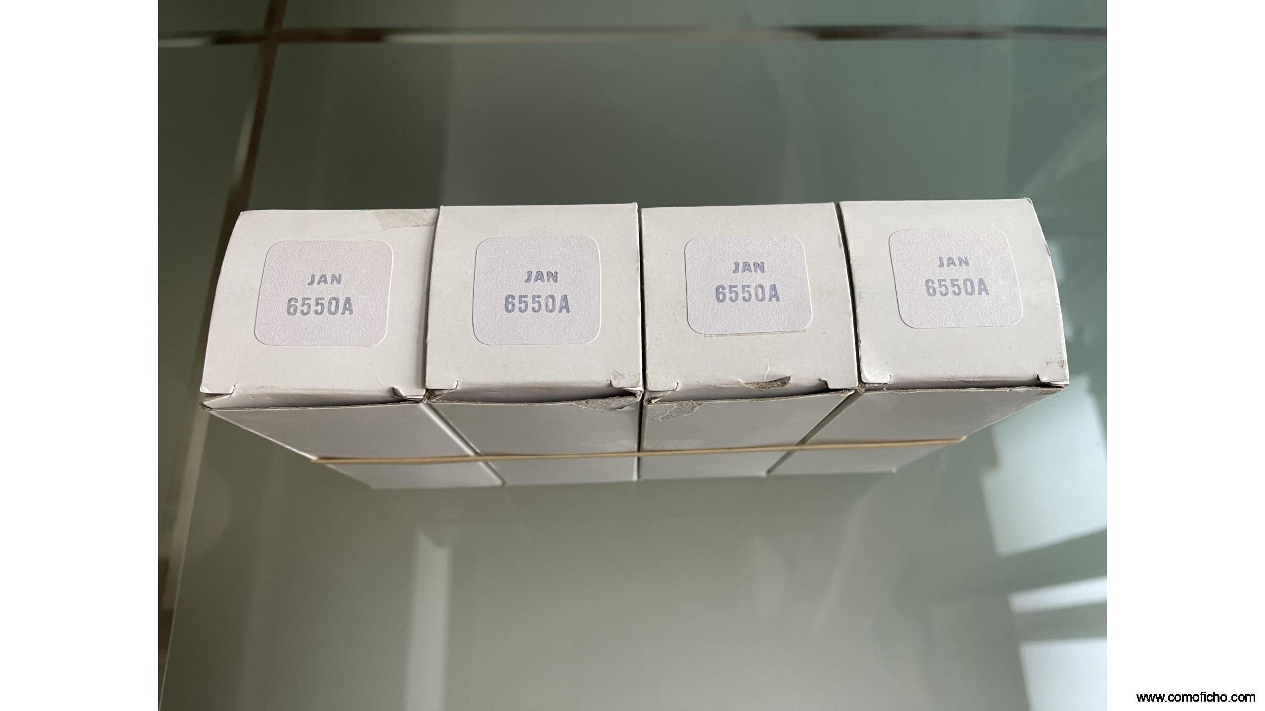 Mached quad de tubos NOS JAN General Electric 6550A. Doble getter superior y uno lateral. Grado militar (JAN). Tiene menos de 250 horas de rodaje aproximadamente pero su especificación de tipo militar le augura al menos 2000 o más horas. Funcionan perfectamente. Especial para amantes del rock por su extensión de las bajas frecuencias. En cajas estandard.